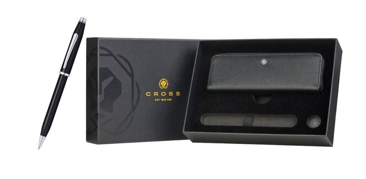 Century II Black Lacquer with Chrome Ballpoint Pen with Classic Black Zippered Leather Double Pen Case Gift Set