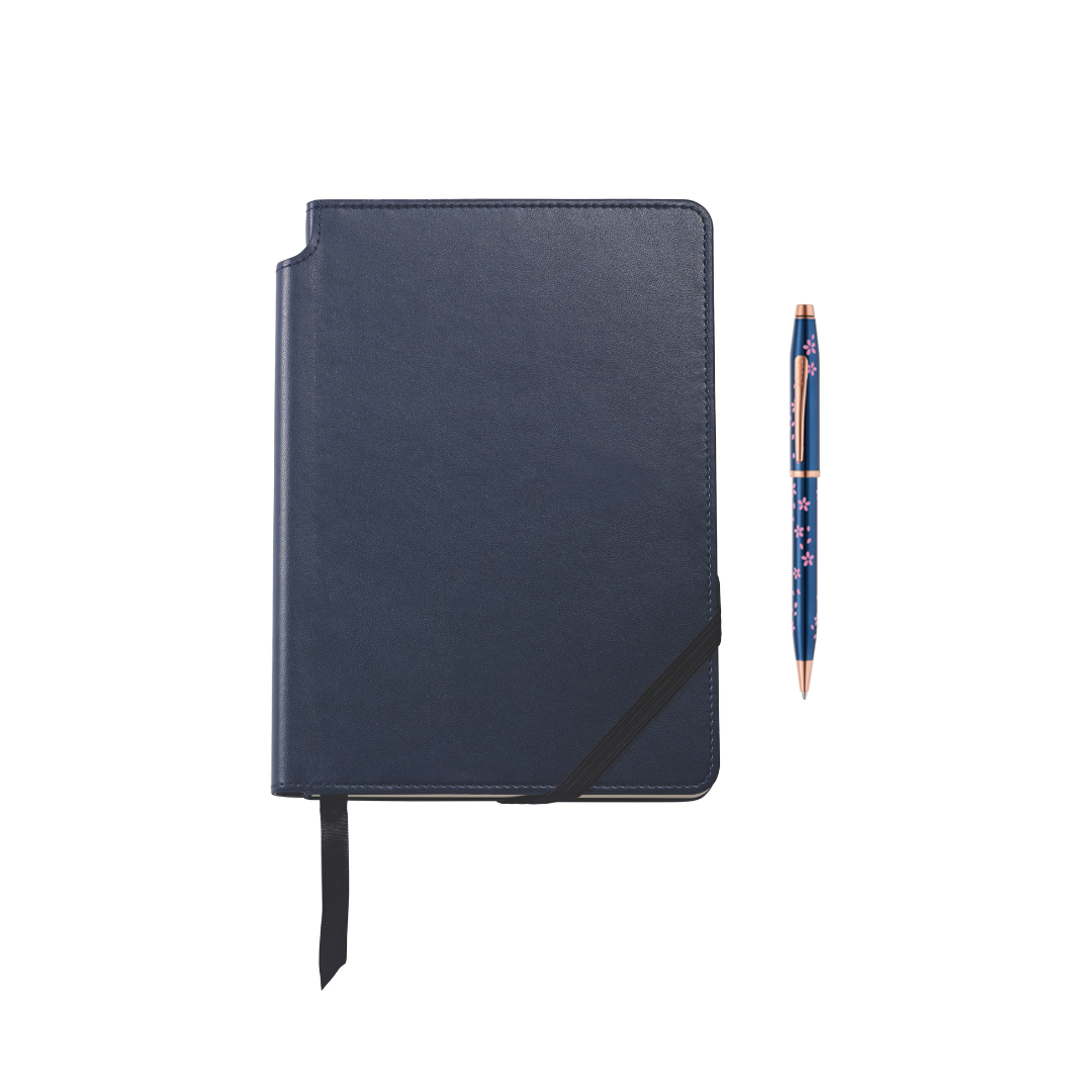 Inspired by the delicate beauty of Sakura blossoms, this exquisite limited edition gift set pairs the Century II Cherry Blossom Translucent Blue Lacquer Ballpoint Pen with a Midnight Blue Cross Journal, both presented in a beautifully appointed keepsake box.