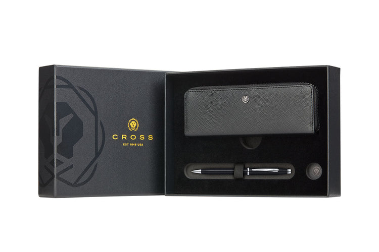 Century II Black Lacquer with Chrome Ballpoint Pen with Classic Black Zippered Leather Double Pen Case Gift Set
